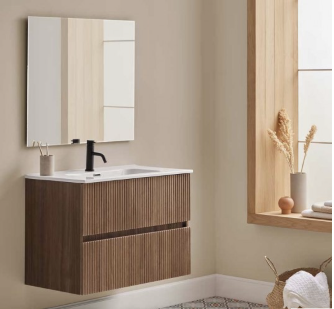 - Composición: Este mueble incorpora lavabo de cerámica Eco y si lo desea, un espejo liso de la serie luna de la misma medida de ancho que el mueble y altura de 70cm. No tendrás problemas en la elección del lavabo ya que lo incluimos compatible con el módulo. Este mueble de baño está compuesto por 2 cajones y con guías hettich de de alta calidad, de cierre progresivo e interior textil. El tirador es uñero para hacre más cómoda la apertura y cierre.