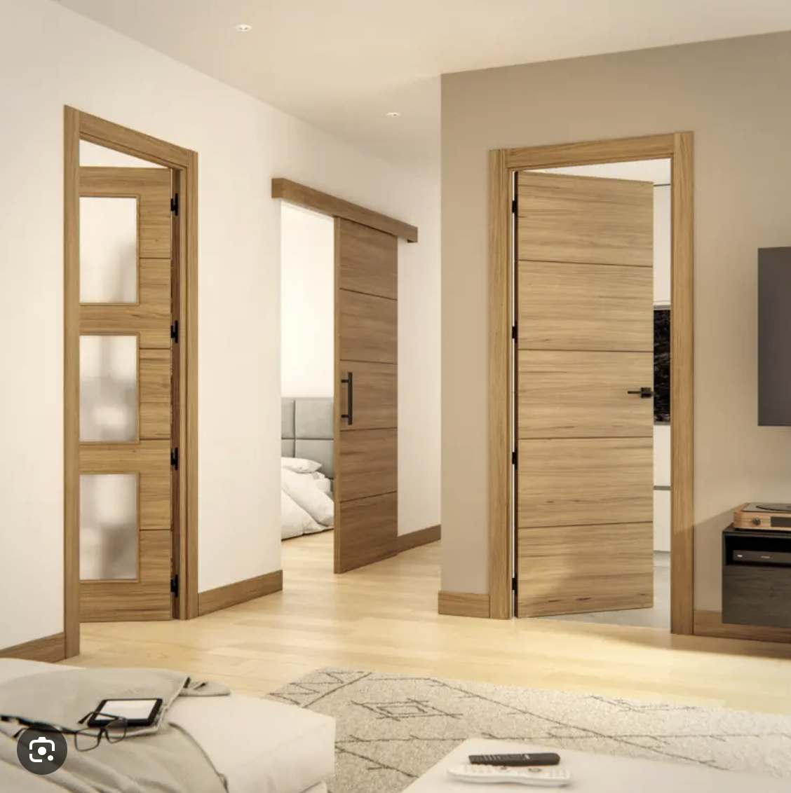 - Puerta de interior maciza ciega o con vidrio abatible de color roble oscuro veteado de apertura derecha y de 72,5cm de ancho de hoja. La puerta incluye bisagras en color negro de serie que le da un toque actual.