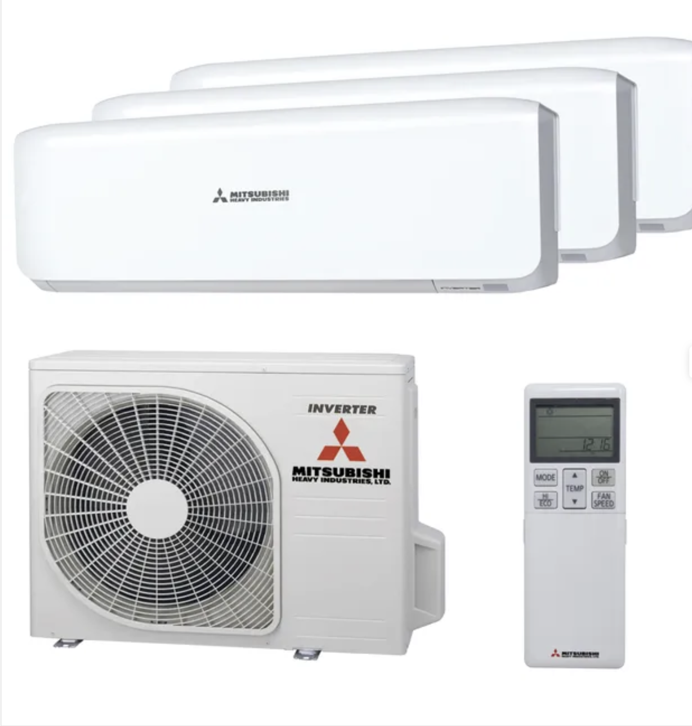 - Aire acondicionado 3x1 multisplit (1290 fr + 1290 fr + 3010 fr) Mitsubishi Heavy Industries, indicado para climatizar viviendas que cuentan con estancias a climatizar independientemente. Se compone de 2 unidades interiores y una exterior, función "inverter" con bomba de calor, por lo que podrás usarlo todo el año, modo silencio (con una emisión sonora mínima de 19 dB), programación semanal y mando a distancia.